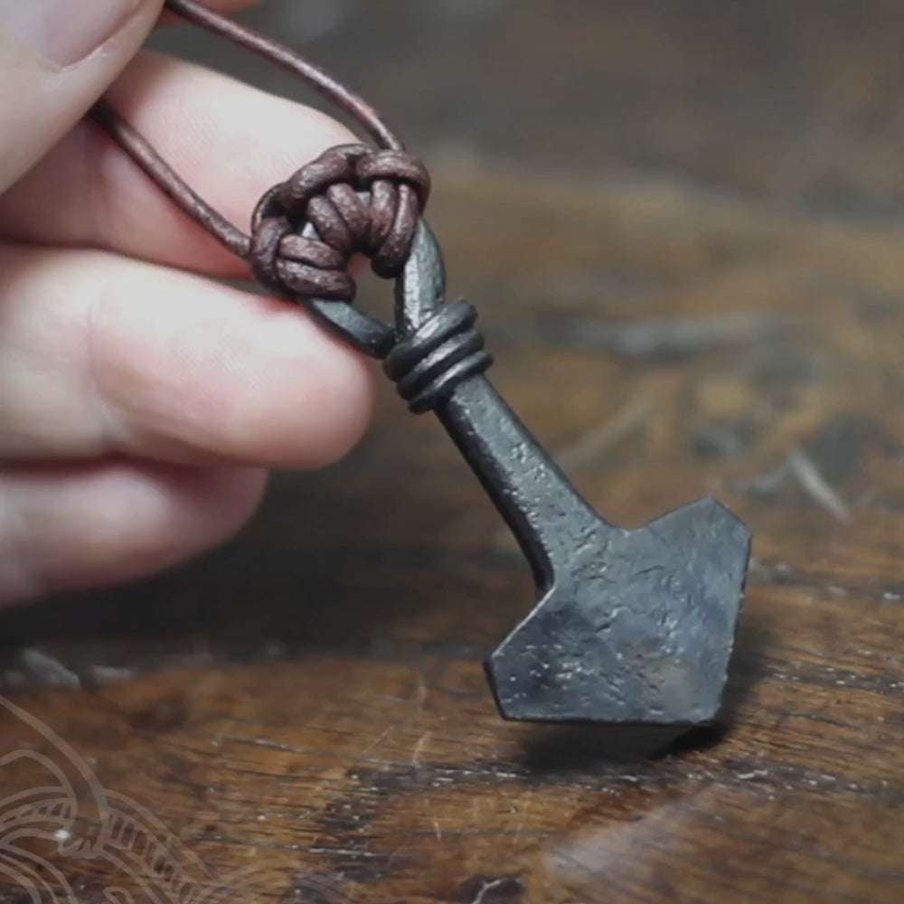 This large sized Viking Thor's hammer has been completely hand forged out of iron using traditional blacksmithing techniques. The Mjolnir pendant is suspended on a adjustable leather cord. This one is one of our older designs.