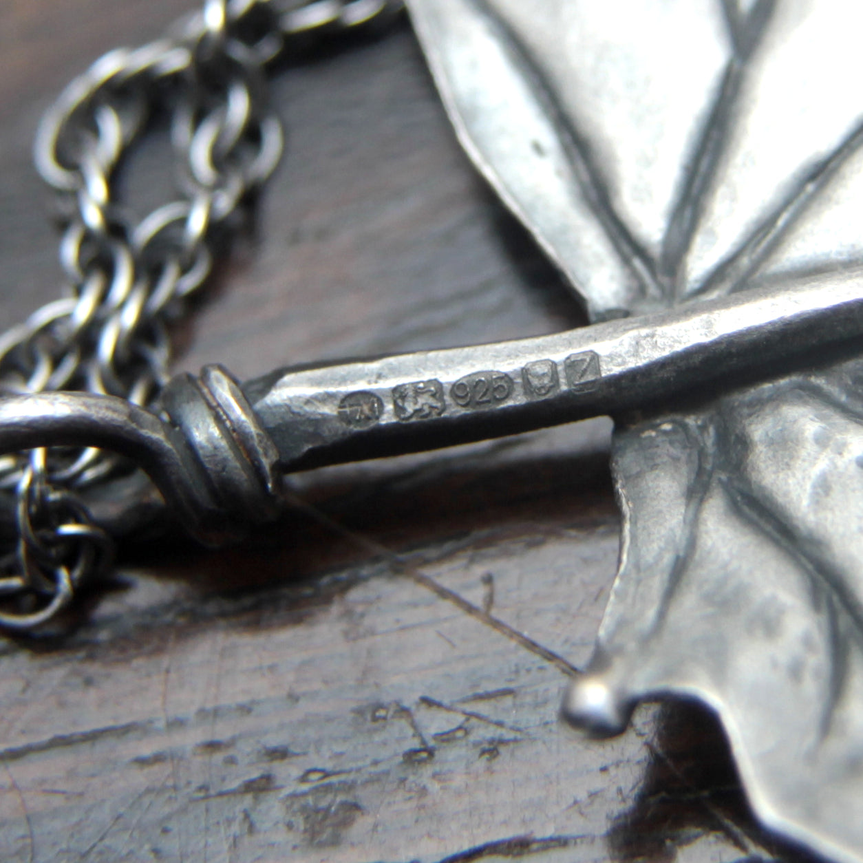 This leaf is completely unique, like the individual real young maple leaf this pendant is traced from. The shape is hand sawed of thin silver sheet out and the veins are repoussed. The stem is forged. These trees grow by our forge and in the spring are a deep dark red colour. The leaves are traced before they reach their full size to make light wearable jewellery that stands out.